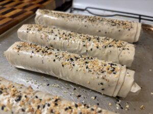 I have then sprayed with a little more oil, then sprinkled with a Bagel Seasoning Mix, then baked into a preheated oven at 180 degrees C for 25 minutes.