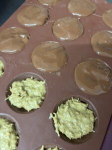 Using two blocks of Old Gold Dark Chocolate and a block of Milk Cooking Chocolate, i have melted these down and brushed into the cups of the silicone forms i was using. I have then popped these into the fridge for the shells to harden.