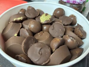I have then spooned this pistachio mixture into the preprepared chocolate shells. Then i have spooned remaining chocolate on top to form the remaining shell and popped these back into the fridge to set.