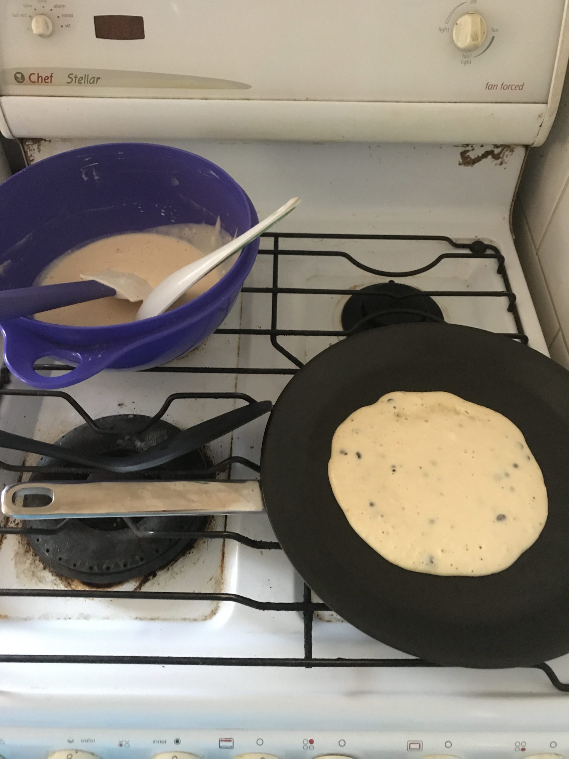 The over a medium heat with a flat pan, with a small amount of oil or butter, pour some of the batter into the pan, cook until bubbles form on the surface, then flip, cook until both sides golden.