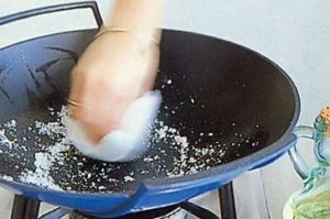 Step 2: Add a tablespoon of peanut oil to the wok and swirl it around. Add 2 teaspoons of coarse salt and rub the salt and oil into the surface of the wok with a paper towel. Set the wok aside to cool. Wipe the salt out with a clean paper towel and repeat steps 1 and 2 three more times. The wok is now seasoned.