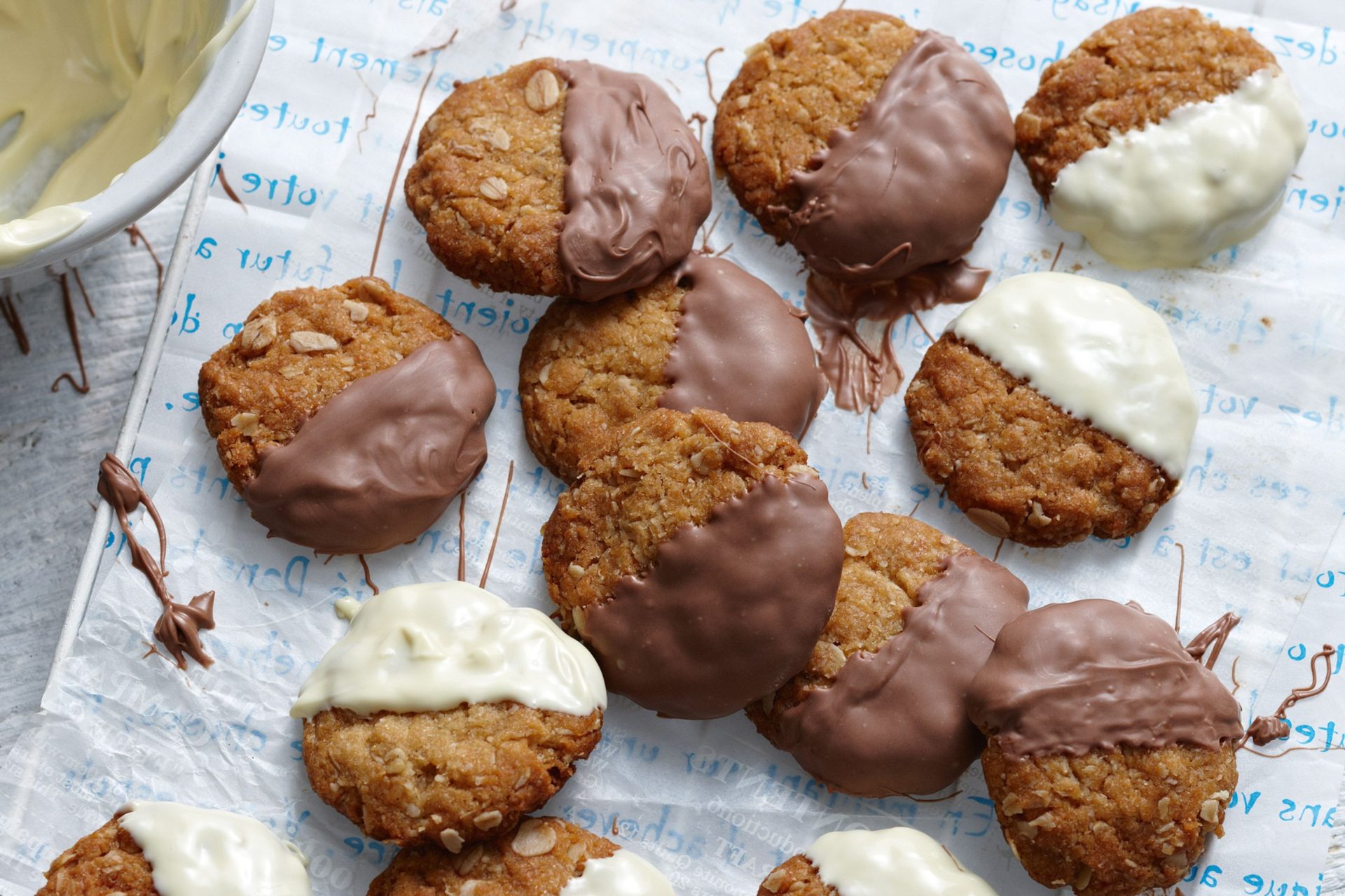 - Spread 1 tablespoon of melted chocolate on the base of each biscuit and place chocolate side up on a wire rack or until set.
