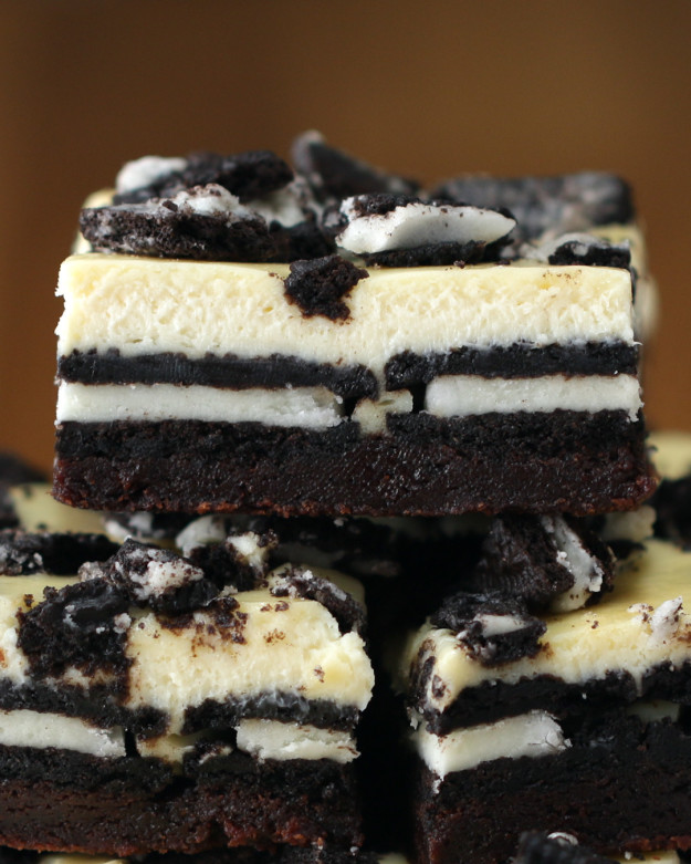 - Place 24 of the sandwich cookies in a single layer on top of the brownie batter. 7. To fill in the edges, cut 6 of the cookies in half and nudge those in.