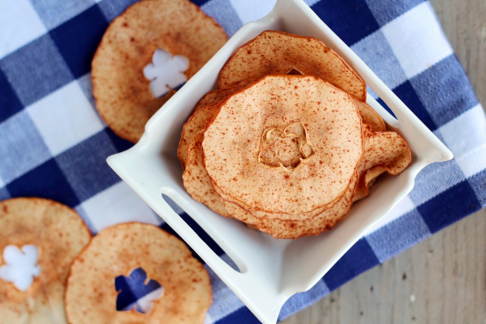 - Line 1-2 baking sheets with parchment paper and spread out the apple slices in a single layer. Sprinkle lightly with cinnamon.