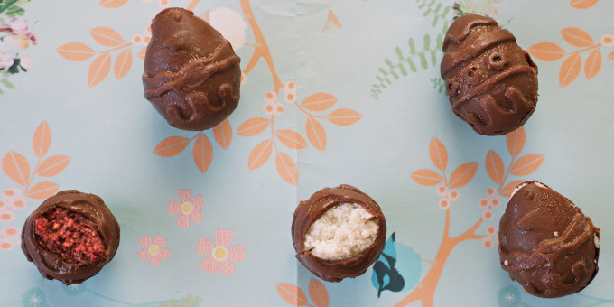 - Remove the chocolate from the freezer and spoon approximately ½ teaspoon of filling into each egg half. Place back into the freezer to set, approximately 20 minutes.