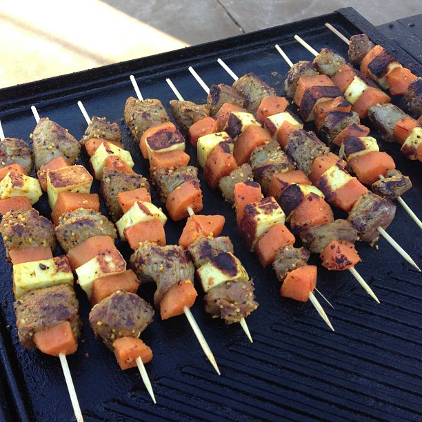 - Toss lamb, haloumi and sweet potato in Moroccan seasoning then thread a piece of each onto a toothpick or onto skewers.