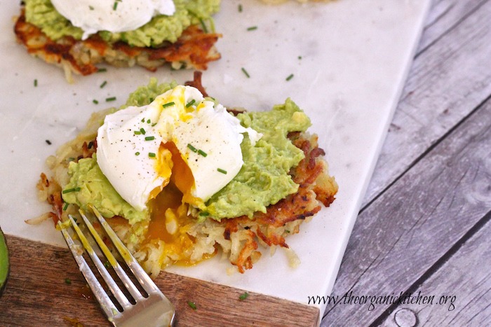 - Remove potato patties from pan and top with mashed avocado and poached eggs.