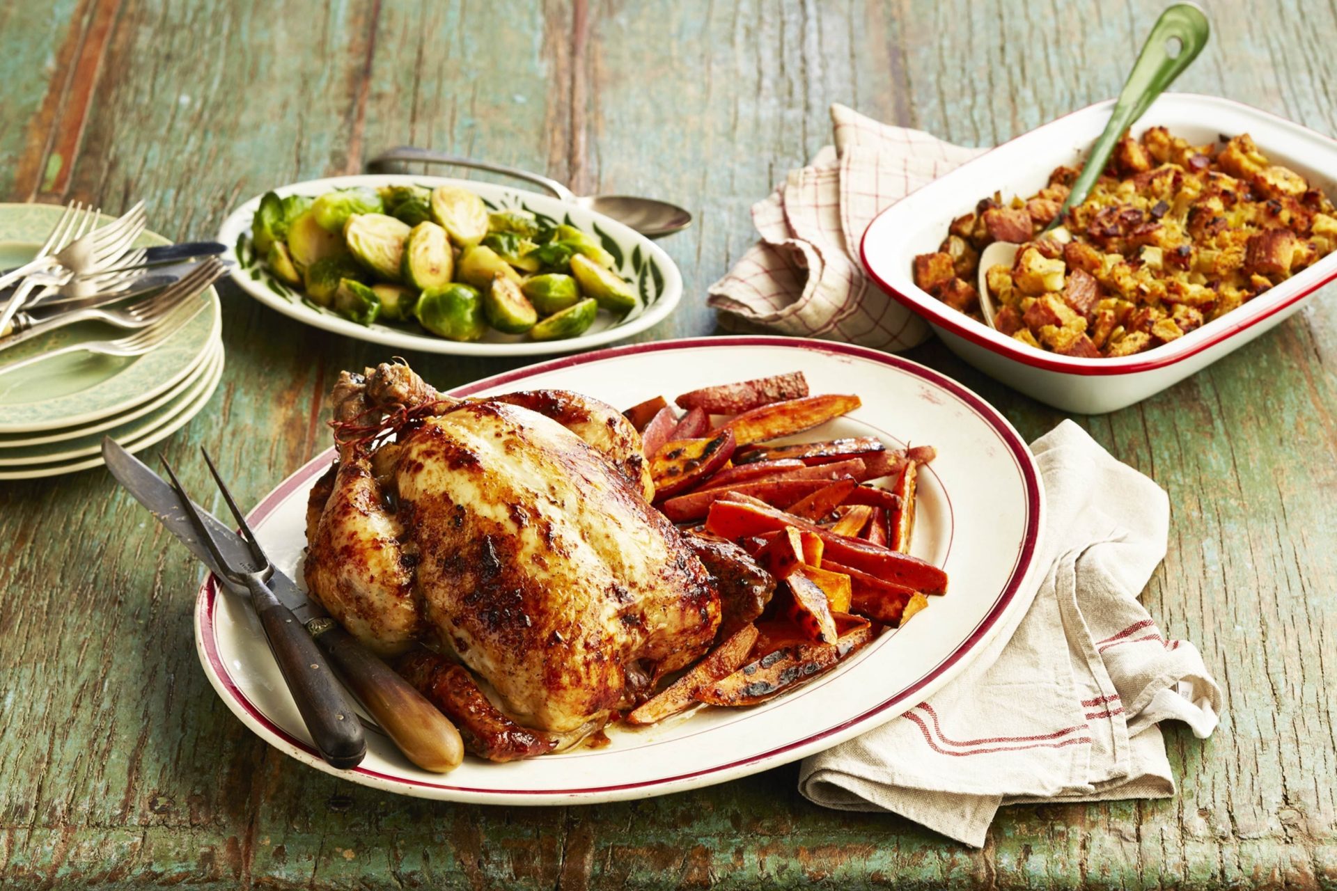 - Remove the stuffing from the chicken cavity. Carve the chicken and serve with the stuffing, brussels sprouts and wedges.
